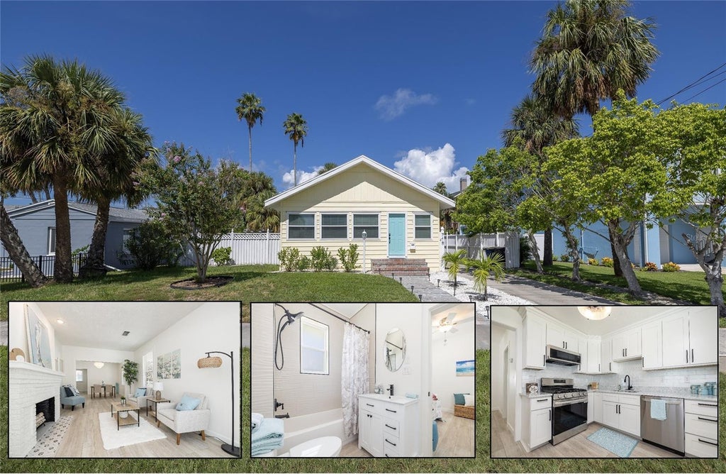 EVERYTHING IS BRAND NEW – AND IS COMPLETELY PERMITTED! This charming 1931 bungalow has undergone a meticulous renovation! All floors were removed down to the joists, and walls were taken down to the studs and rebuilt after a complete professional mold remediation. There is a Brand New Electrical Panel with surge protection and grounding devices, and all new electrical UFI waterproof wiring throughout the entire home. Brand New waterproof subfloors and vinyl flooring. New interior and exterior doors, luxury vinyl plank flooring throughout, a 40-gallon gas water heater, and all new lighting fixtures. These upgrades not only ensure a beautiful and modern living experience, but also contribute to the home's energy efficiency! In the kitchen, modern touches blend with timeless beauty with Cambria quartz countertops and white shaker cabinets framed with shimmering glass tile. The Energy Saver LG stainless steel appliances (including a gas range and French door refrigerator) all have a two-year transferable warranty. The full bathroom features a new shower surround, and both bathrooms have new vanities with black matte fixtures, and new dual-flush water-saving toilets. The Half Bathroom/Laundry Room combo offers Brand New, energy-efficient LG Thin Q washer and dryer! The 2023 air conditioner and 2014 windows will keep you cool in the summer months, and the upgraded wood-burning fireplace will keep you cozy on a Florida ‘winter’ evening. Rest safe and assured under the newer 2014 Roof with a 30-year warranty while enjoying the charm of this original Clearwater Beach bungalow. The backyard features a newer wood-deck patio, ample in size and perfect for gatherings! There is plenty of room for a pool, or even for the possibility of expanding on the home, if desired. The Sand Room heading inside from the back yard is a great storage area for your beach toys and equipment! There is a large shed in the back yard that remains with the home, and can house all of your outdoor toys! With only 777 steps to the beautiful North Clearwater Beach, this home offers ALL of what paradise is made of. Surrounded by Clearwater's most prestigious beaches, restaurants, and the BEST of Florida living, this home also has substantial rental potential! The Public Access to the Intracoastal is located only steps away, under a minute walk. Only a 5-minute walk to the North Clearwater Beach Access, an 8-minute walk to McKay Park, only a 25-minute drive to PIE Int'l Airport, about a 30-minute drive to Tampa Int'l Airport, and endless shopping and dining options nearby!